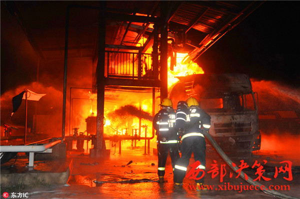 據(jù)了解,事故發(fā)生油罐區(qū)占地約40畝,主要生產(chǎn)航空汽油,油罐區(qū)共有油罐10個(gè),油罐內(nèi)裝有原料及航空汽油約300余噸,發(fā)油平臺(tái)往罐車內(nèi)輸送航空汽油時(shí)突然發(fā)生火災(zāi),燒毀發(fā)油平臺(tái)及油罐車等,著火油罐車儲(chǔ)量30噸,著火時(shí)車內(nèi)汽油約10噸,過濾器中有油約7噸,共計(jì)約17噸燃油,離鄰近儲(chǔ)油罐約30米。