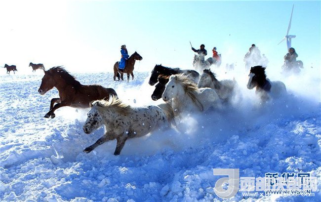 眼下,內(nèi)蒙古正值冬季旅游旺季,牧民們?cè)诎籽└采w的草原上馴馬,迎接八方游客的到來。
