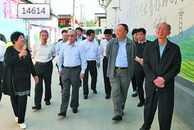 全國黨建研究會會長李景田(前排左四)、副會長杜德?。ㄇ芭抛蠖┑纫恍性谏轿魇x城市調(diào)研基層黨建。焦建宇攝/光明圖片