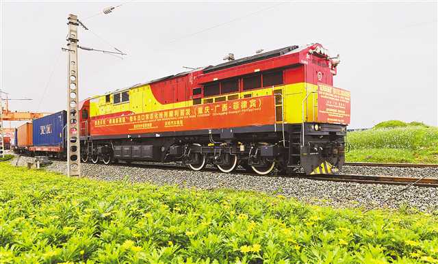 滿載125臺整車的專列從重慶沙坪壩區(qū)團結(jié)村中心站駛出,標志著西部陸海新通道整車出口常態(tài)化班列的開啟。(本報資料圖片) 記者 羅斌 攝