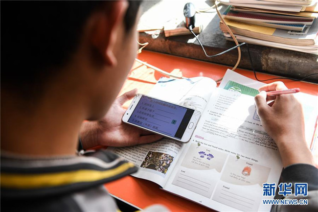 內(nèi)蒙古準(zhǔn)格爾旗龍口鎮(zhèn)紅樹(shù)梁村的初一學(xué)生劉進(jìn)才在家中上網(wǎng)課(3月10日攝)。新華社記者 劉磊 攝