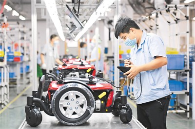 近來(lái),江西省豐城市外貿(mào)企業(yè)通過(guò)與電商平臺(tái)合作、云推介等方式促進(jìn)企業(yè)穩(wěn)產(chǎn)增效。圖為豐城市捷和電機(jī)(江西)有限公司員工在生產(chǎn)線上組裝電動(dòng)輪椅車,準(zhǔn)備出口至歐洲、中東、非洲等地市場(chǎng)。周 亮攝(人民視覺)