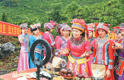 7月11日,廣西羅城仫佬族自治縣“仫佬十姐妹”直播團(tuán)隊(duì)在四把鎮(zhèn)集環(huán)村介紹當(dāng)?shù)剞r(nóng)特產(chǎn)品,通過(guò)電商直播“帶貨”,助力脫貧攻堅(jiān)。韋如代攝(人民視覺)