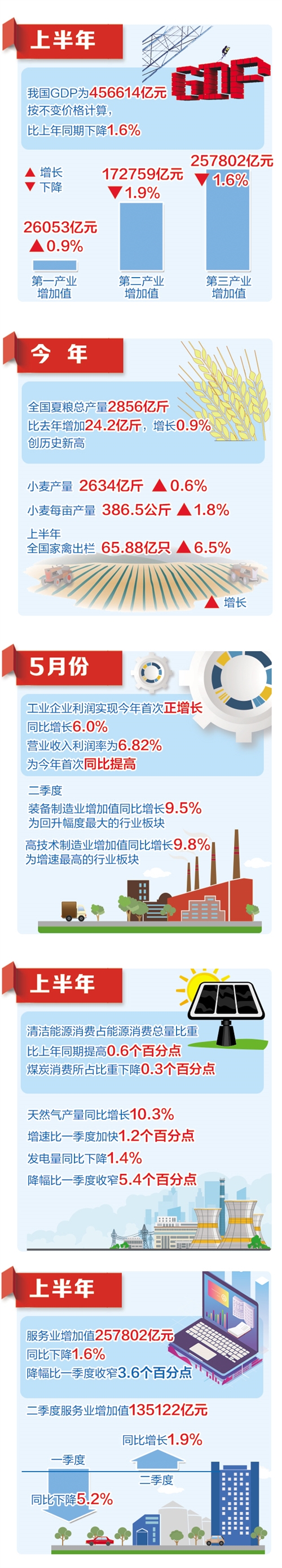 上半年,我國(guó)GDP為456614億元,按不變價(jià)格計(jì)算,比上年同期下降1.6%。其中,第一產(chǎn)業(yè)增加值26053億元,增長(zhǎng)0.9%;第二產(chǎn)業(yè)增加值172759億元,下降1.9%;第三產(chǎn)業(yè)增加值257802億元,下降1.6%。