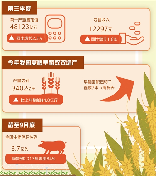數(shù)據(jù)顯示,前三季度我國第一產(chǎn)業(yè)增加值48123億元,同比增長2.3%;農(nóng)民收入12297元,同比增長1.6%。農(nóng)業(yè)生產(chǎn)形勢較好,成為國民經(jīng)濟(jì)運(yùn)行的突出亮點(diǎn),“三農(nóng)”壓艙石作用更加凸顯,為穩(wěn)定經(jīng)濟(jì)社會發(fā)展大局提供了有力支撐。