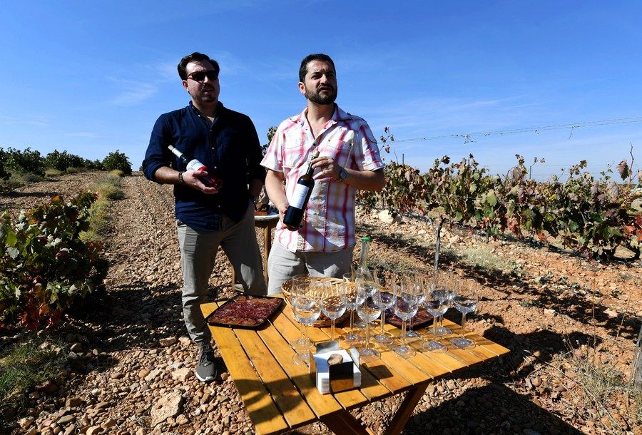 2017年9月24日,在西班牙葡萄酒產(chǎn)區(qū)巴亞多利德市的一處葡萄園內(nèi),兩名村民在展示當(dāng)?shù)蒯劸频钠咸选_@里的葡萄酒有一部分會通過“義新歐”班列出口到中國。新華社發(fā) (郭求達 攝)
