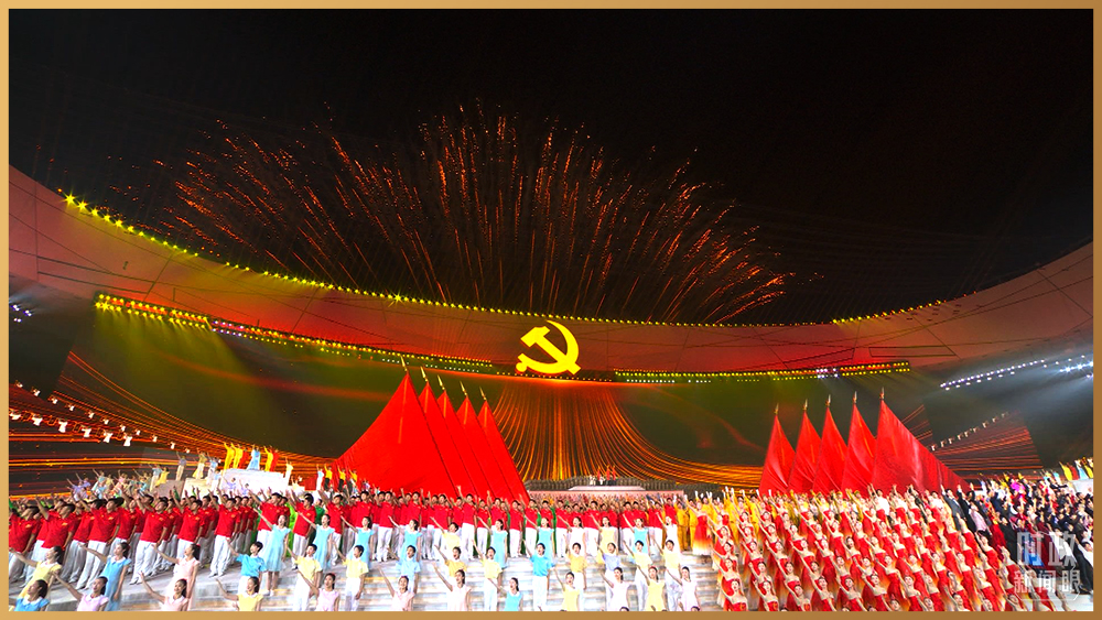 情景交響歌舞《人民至上》,再現(xiàn)舉國(guó)動(dòng)員、全民戰(zhàn)“疫”。鼓樂歌舞節(jié)目《新的天地》,一百面空中大鼓與地面巨型大鼓遙相呼應(yīng)。在主題曲《領(lǐng)航》的旋律中,高達(dá)16米的金色黨徽在國(guó)家體育場(chǎng)莊嚴(yán)升起。演出過程中,絢爛的焰火一次次盛放在國(guó)家體育場(chǎng)上空,并迅速在網(wǎng)上引發(fā)刷屏。