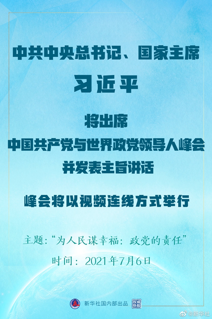 中共中央對(duì)外聯(lián)絡(luò)部發(fā)言人胡兆明5日宣布,中國(guó)共產(chǎn)黨與世界政黨領(lǐng)導(dǎo)人峰會(huì)將于7月6日以視頻連線(xiàn)方式舉行,中共中央總書(shū)記、國(guó)家主席習(xí)近平將在北京出席會(huì)議并發(fā)表主旨講話(huà)。此次會(huì)議的主題為“為人民謀幸福:政黨的責(zé)任”,160多個(gè)國(guó)家的500多位政黨和政治組織等領(lǐng)導(dǎo)人以及逾萬(wàn)名政黨代表等將出席會(huì)議。