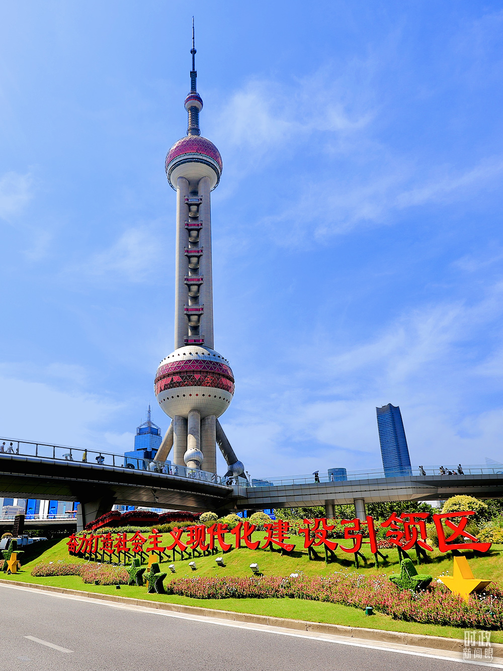 △2021年7月15日,“奮力打造社會主義現代化建設引領區(qū)”的標語矗立在上海陸家嘴綠地中。(圖/視覺中國)