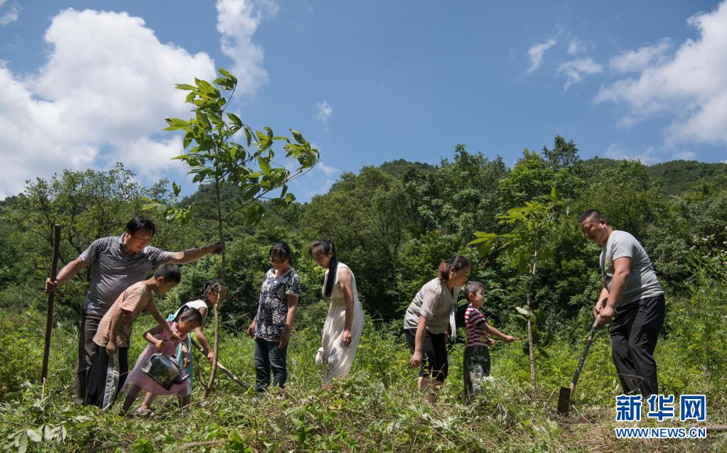 姚祖元(右一)與家人一起種樹(shù)(2019年7月13日攝)。在秦嶺深處的陜西省漢中市留壩縣火燒店鎮(zhèn),姚家5代人歷時(shí)70年深耕秦嶺的故事在當(dāng)?shù)丶矣鲬魰?,傳為佳話?nbsp;新華社記者 陶明 攝