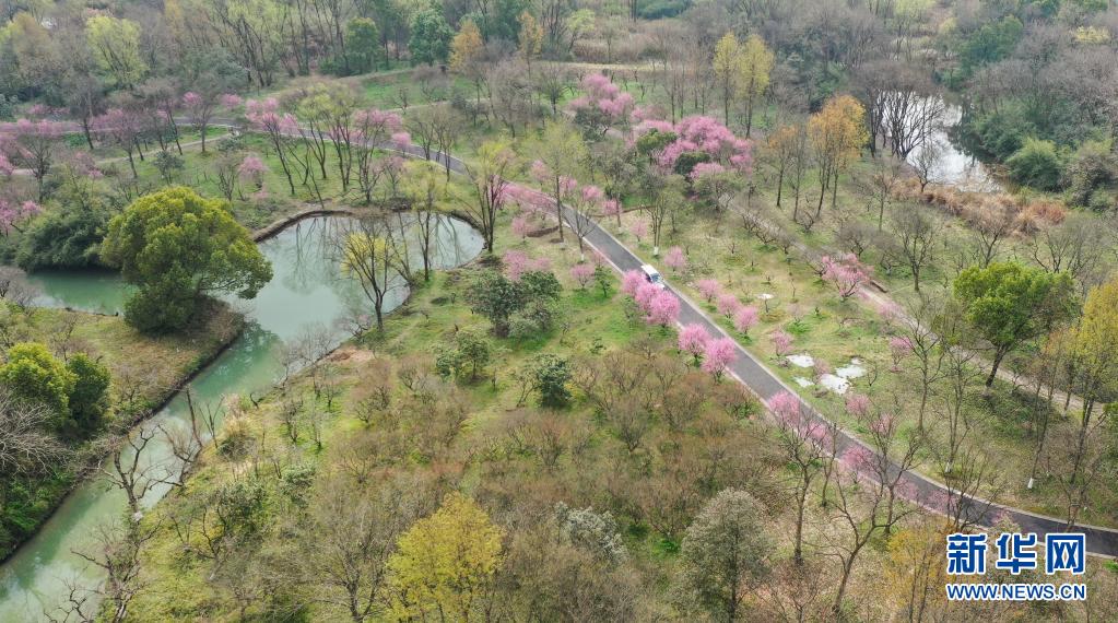 觀光車(chē)在浙江杭州西溪濕地內(nèi)行駛(2021年3月2日攝,無(wú)人機(jī)照片)。 新華社記者 翁忻旸 攝