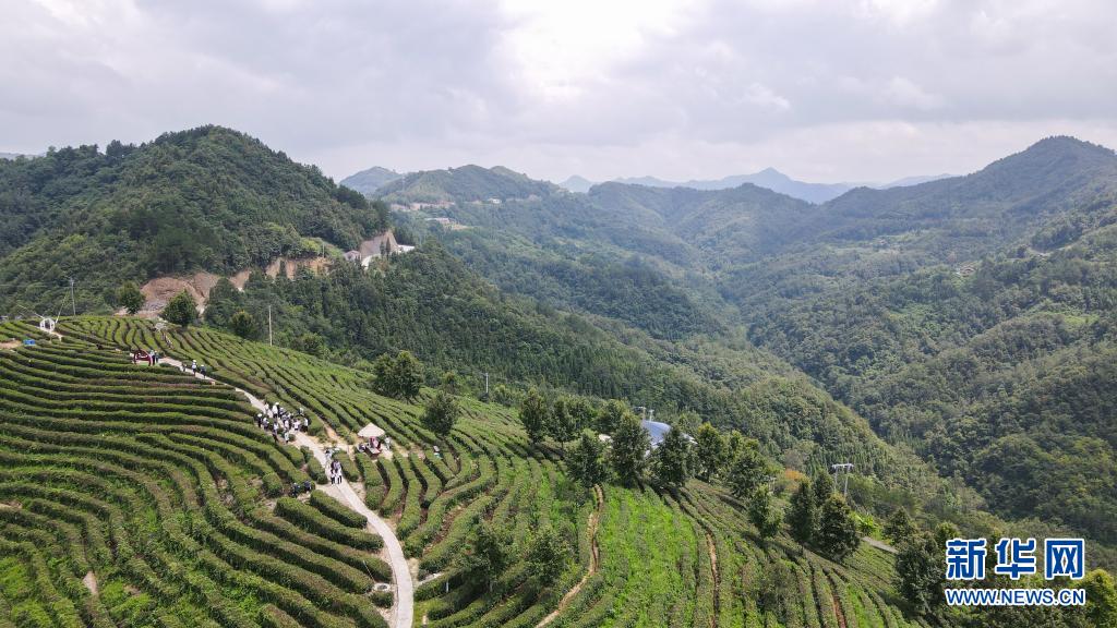 游客在位于陜西省安康市平利縣老縣鎮(zhèn)蔣家坪村的女?huà)z鳳凰茶業(yè)現(xiàn)代示范園區(qū)參觀游玩(2021年7月24日攝,無(wú)人機(jī)照片)。 新華社記者 徐欽 攝