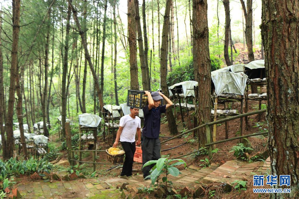 當(dāng)?shù)厝罕娫谫F州省六盤(pán)水市六枝特區(qū)月亮河鄉(xiāng)的花德河國(guó)有林場(chǎng)內(nèi)收獲菌類(lèi)(2021年7月24日攝)。 新華社發(fā)(令狐榮駿 攝)