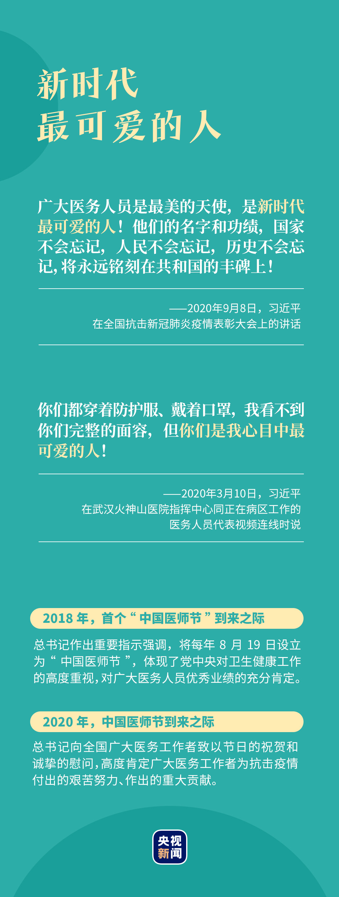 習(xí)近平總書(shū)記非常關(guān)心廣大醫(yī)務(wù)工作者,多次作出重要指示、向醫(yī)務(wù)工作者致以慰問(wèn),親切地稱贊他們?yōu)?ldquo;新時(shí)代最可愛(ài)的人”。