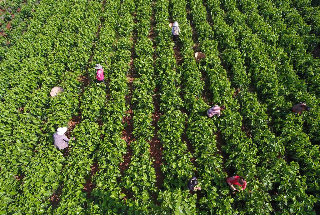 云南省尋甸縣金所街道草海子村的農婦在采摘蠶桑葉(2020年5月16日攝,無人機照片)。新華社記者 楊宗友 攝