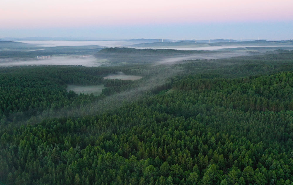 ↑塞罕壩國(guó)家森林公園晨景(2021年6月27日攝,無(wú)人機(jī)照片)。