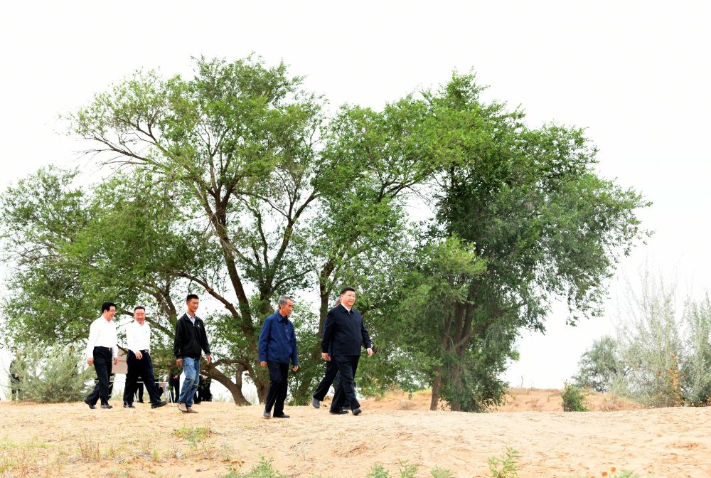 ↑2019年8月21日,習(xí)近平來(lái)到甘肅武威市古浪縣八步沙林場(chǎng),實(shí)地察看當(dāng)?shù)刂紊吃炝?、生態(tài)保護(hù)等情況。