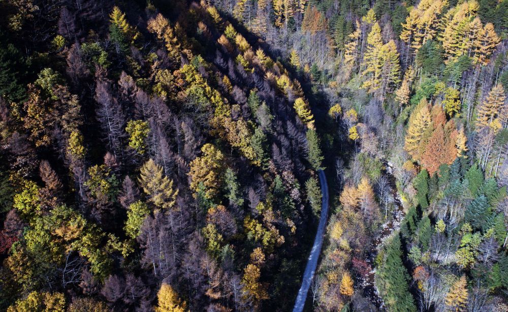 ↑秦嶺秋景(2018年10月26日攝,無(wú)人機(jī)照片)。