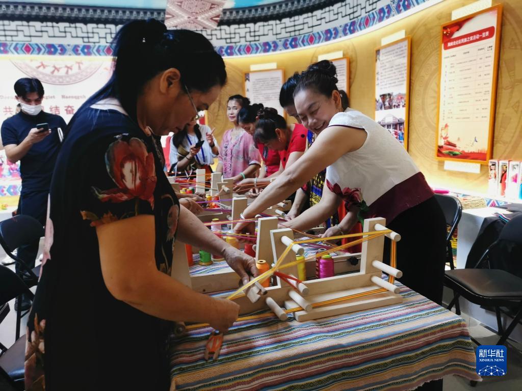 在廣西南寧市青秀區(qū)鳳嶺北社區(qū)民族之家,社區(qū)居民在用簡(jiǎn)易織機(jī)制作壯錦(2020年7月21日攝)。新華社記者 黃慶剛 攝