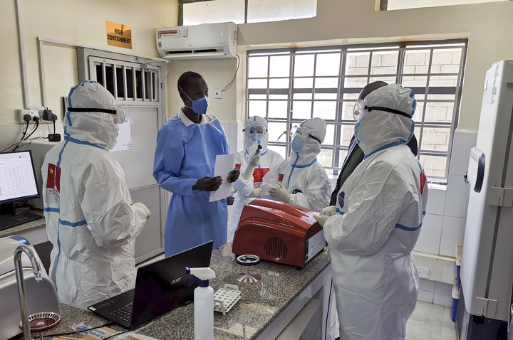 在南蘇丹首都朱巴的一處新冠病毒檢測機構(gòu),中國抗疫醫(yī)療專家組成員與南一線醫(yī)護人員交流(2020年8月21日攝)。新華社發(fā)(中國駐南蘇丹大使館供圖)