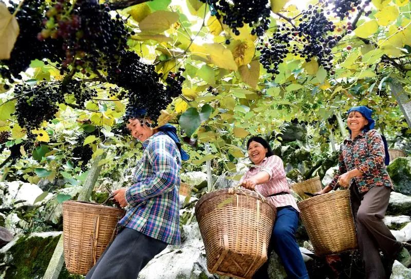 ▲ 9月1日,廣西都安瑤族自治縣菁盛鄉(xiāng)加禾村,當(dāng)?shù)卮迕駥倓偛烧纳狡咸寻嵯律健D壳?,山葡萄已成為?dāng)?shù)剞r(nóng)民增收和鄉(xiāng)村振興的重要產(chǎn)業(yè) 周華攝/本刊