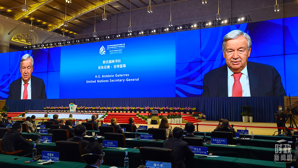 △聯(lián)合國秘書長古特雷斯通過視頻方式致辭。(總臺(tái)央視記者舒貝拍攝)