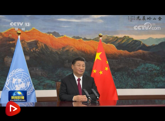 △習(xí)近平主席通過視頻方式發(fā)表主旨講話。(總臺(tái)央視記者胡瑋拍攝)