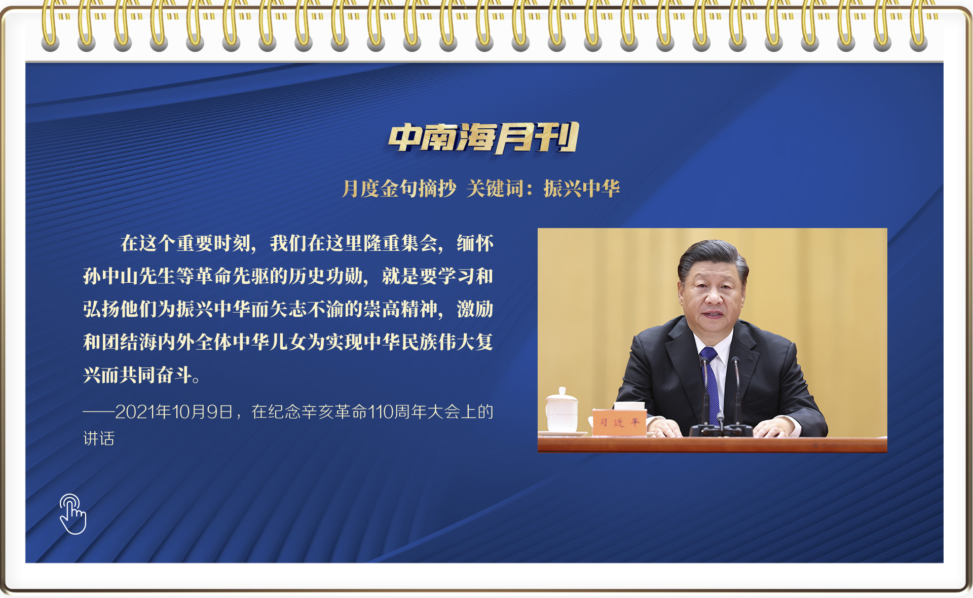 4000余字的講話(huà)全文中,“復(fù)興”一詞出現(xiàn)了25次。今年是辛亥革命110周年,也是中國(guó)共產(chǎn)黨成立100周年。在這個(gè)重要時(shí)刻,總書(shū)記站在實(shí)現(xiàn)中華民族偉大復(fù)興的高度上回望歷史、剖析現(xiàn)實(shí)、啟迪未來(lái),為全面建成社會(huì)主義現(xiàn)代化強(qiáng)國(guó)、實(shí)現(xiàn)中華民族偉大復(fù)興匯聚磅礴力量。