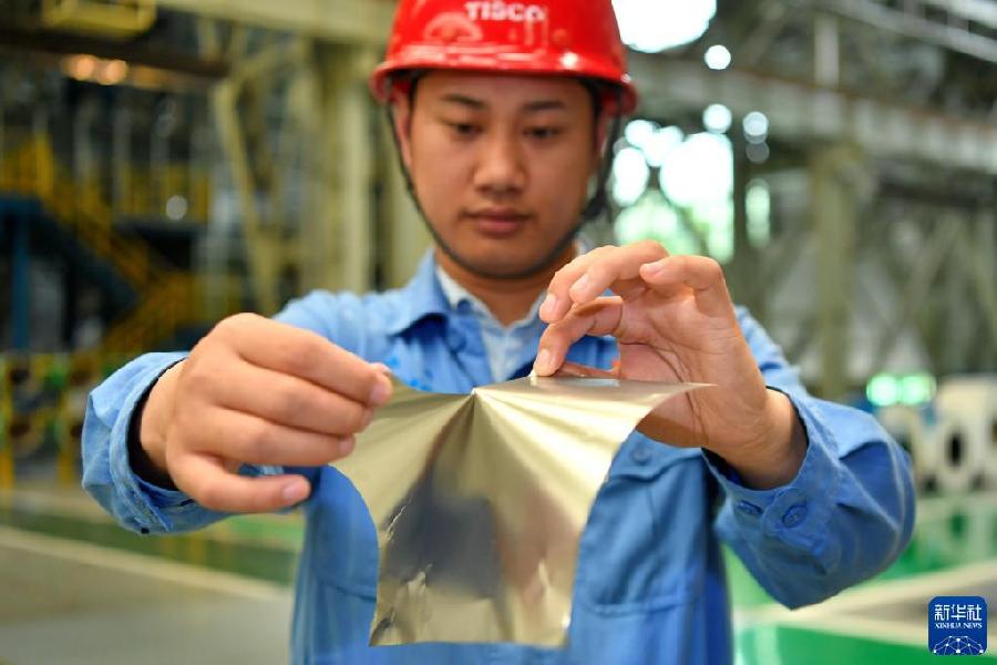 在位于山西的太鋼集團(tuán),員工展示用手撕開(kāi)0.02毫米厚的超薄帶狀不銹鋼(2019年5月24日攝)。新華社記者 曹陽(yáng) 攝