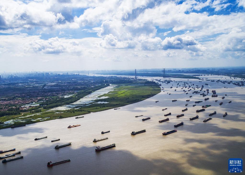 船舶在湖北省武漢市陽(yáng)邏港區(qū)水域行駛(2018年8月13日攝,無(wú)人機(jī)照片)。新華社記者 肖藝九 攝