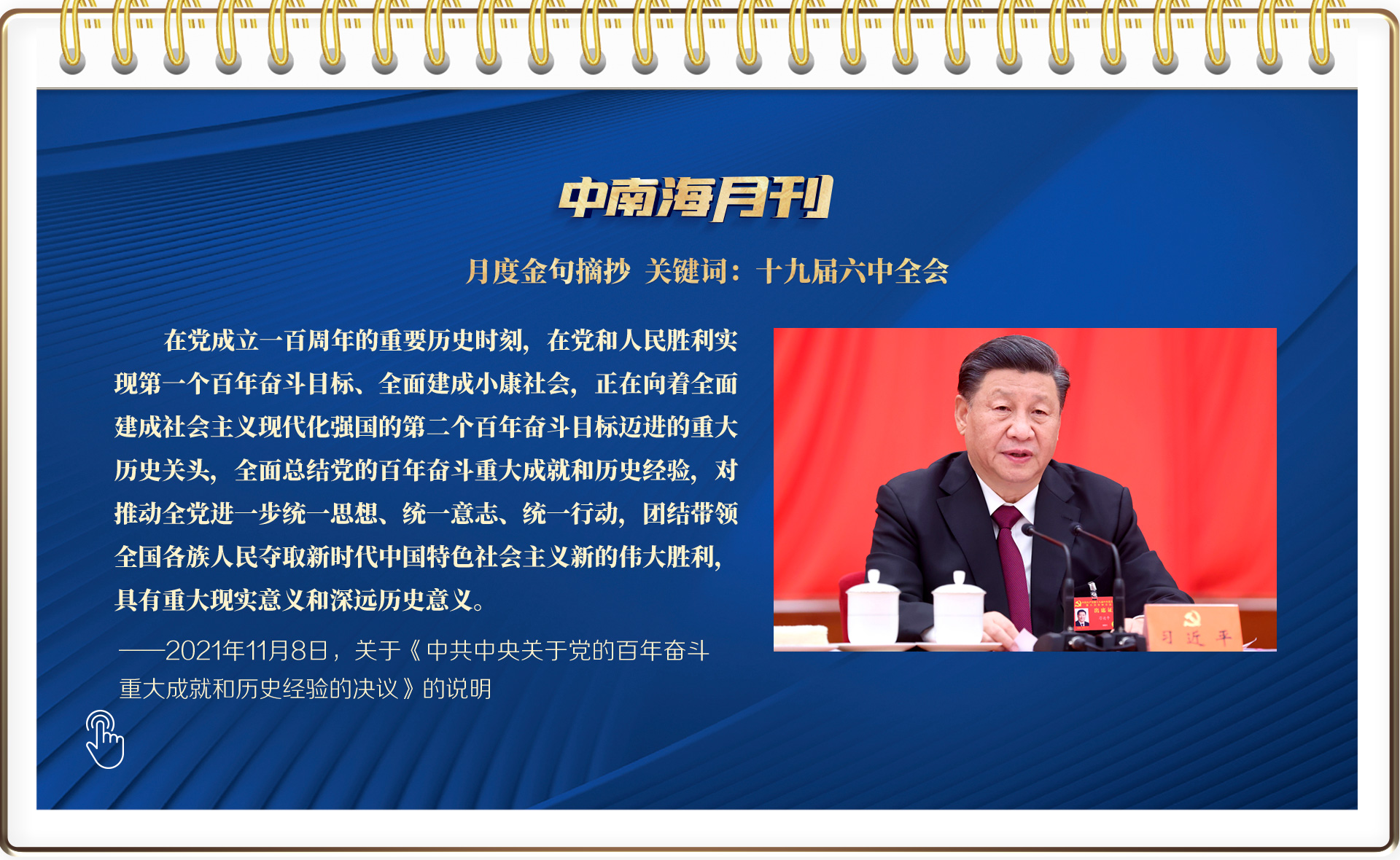 這個月,中國共產(chǎn)黨第十九屆中央委員會第六次全體會議(以下簡稱十九屆六中全會)在京召開,習(xí)近平總書記作重要講話。全會審議通過了《中共中央關(guān)于黨的百年奮斗重大成就和歷史經(jīng)驗的決議》,《決議》總結(jié)了黨團結(jié)帶領(lǐng)人民群眾百年奮斗的重大歷史成就,凝聚起向第二個百年奮斗目標(biāo)奮進(jìn)的強大力量。
