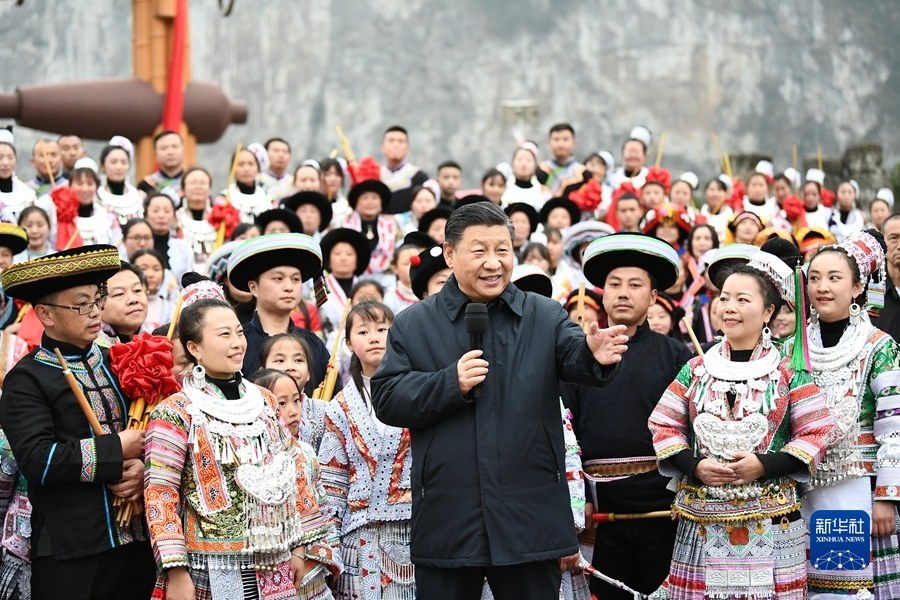 2021年2月3日至5日,中共中央總書記、國家主席、中央軍委主席習(xí)近平來到貴州考察調(diào)研,看望慰問各族干部群眾,向全國各族人民致以美好的新春祝福。這是3日下午,習(xí)近平在畢節(jié)市黔西縣新仁苗族鄉(xiāng)化屋村文化廣場上,向全國各族人民、港澳臺同胞和海外僑胞拜年。