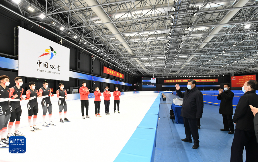 2022年1月4日,中共中央總書(shū)記、國(guó)家主席、中央軍委主席習(xí)近平在北京考察2022年冬奧會(huì)、冬殘奧會(huì)籌辦備賽工作。這是4日下午,習(xí)近平在二七廠(chǎng)冰雪項(xiàng)目訓(xùn)練基地速滑館,向參訓(xùn)運(yùn)動(dòng)員、教練員表示慰問(wèn)。新華社記者 謝環(huán)馳 攝