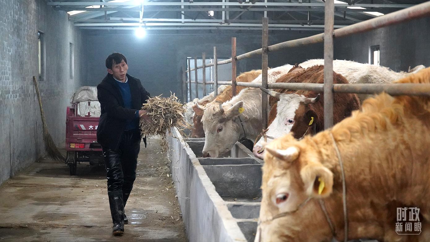 △段村經(jīng)濟合作社養(yǎng)?;兀ぷ魅藛T正在添飼料。(總臺央廣記者潘毅拍攝)