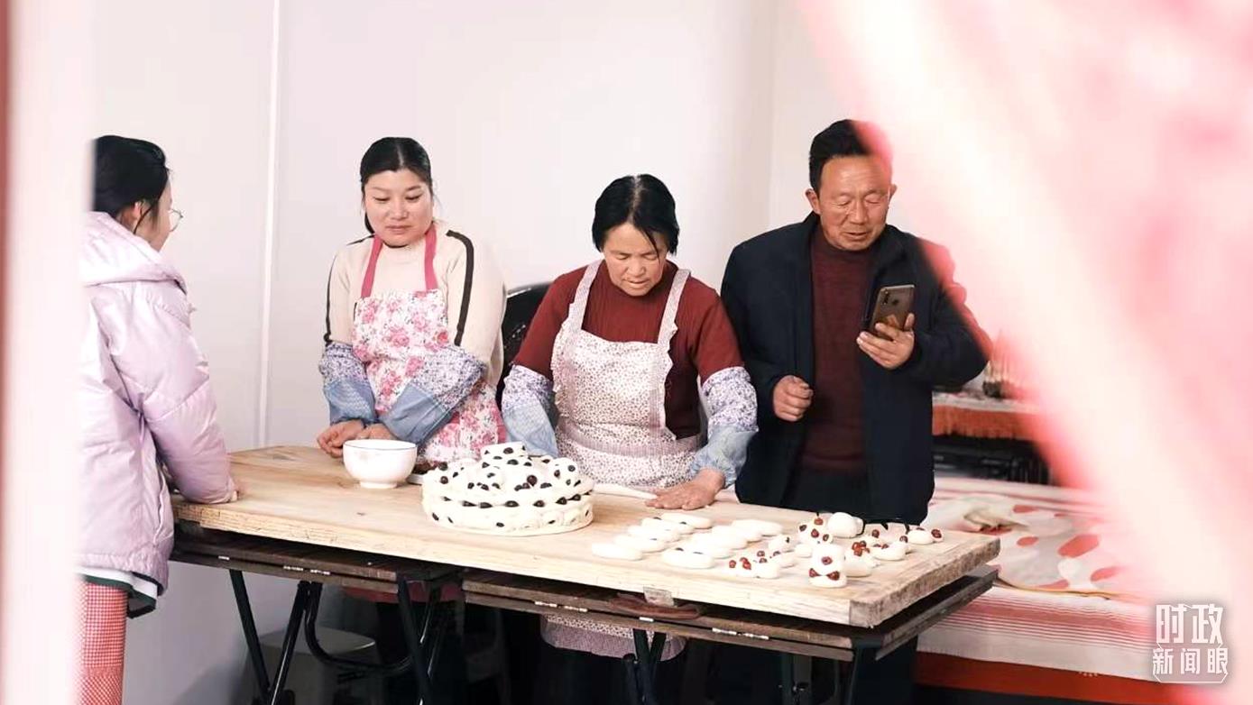 △師紅兵(右一)和妻子朱海丹(右二)正在制作年饃。(總臺央視記者盧心雨拍攝)