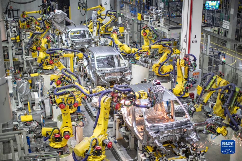 重慶一家新能源汽車企業(yè)使用智能化焊接機器人進(jìn)行焊接作業(yè)(2021年4月2日攝)。新華社記者 黃偉 攝