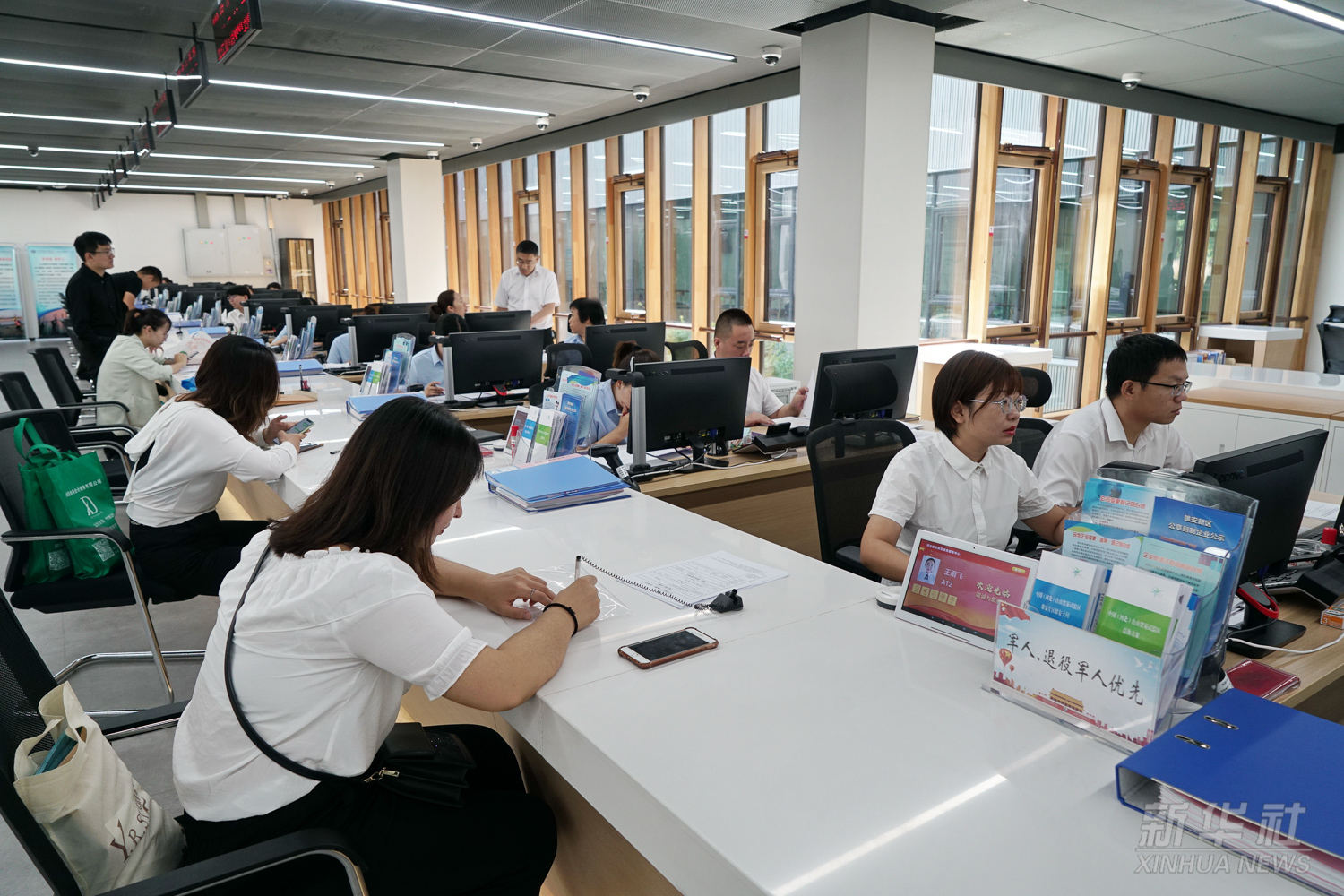 企業(yè)工作人員在中國(河北)自由貿(mào)易試驗區(qū)雄安片區(qū)政務(wù)服務(wù)中心辦理業(yè)務(wù)(2019年8月30日攝)。2019年8月,中國(河北)自由貿(mào)易試驗區(qū)在雄安新區(qū)正式揭牌。試驗區(qū)實施范圍119.97平方公里,涵蓋雄安片區(qū)、正定片區(qū)、曹妃甸片區(qū)、大興機場片區(qū)四個片區(qū)。