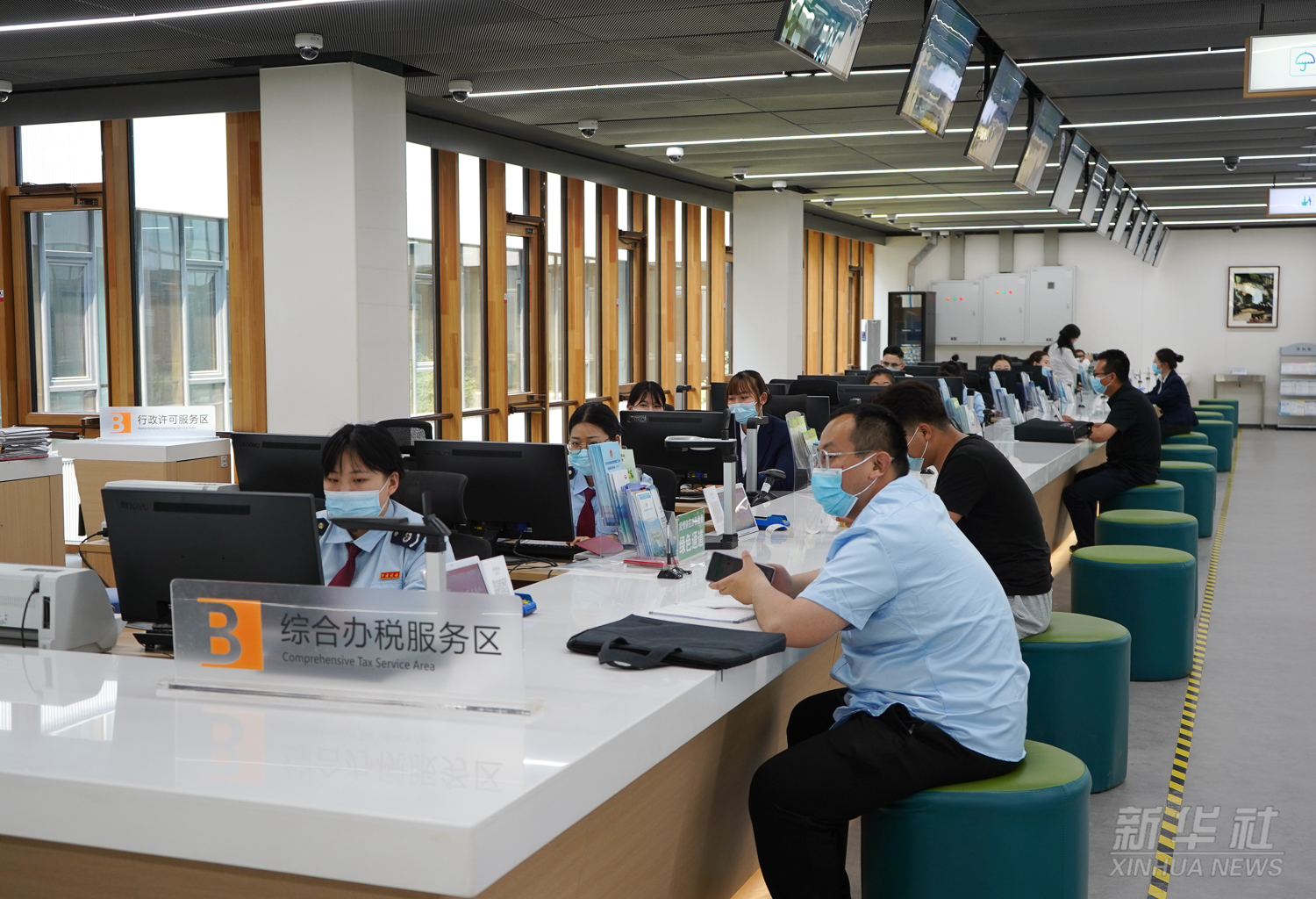 工作人員在河北雄安新區(qū)政務(wù)服務(wù)中心綜合辦稅服務(wù)區(qū)為居民辦理業(yè)務(wù)(2021年5月12日攝)。雄安新區(qū)政務(wù)服務(wù)中心成立于2018年5月30日,為企業(yè)和個人提供“一站式”行政審批事項受理和便民業(yè)務(wù)受理。