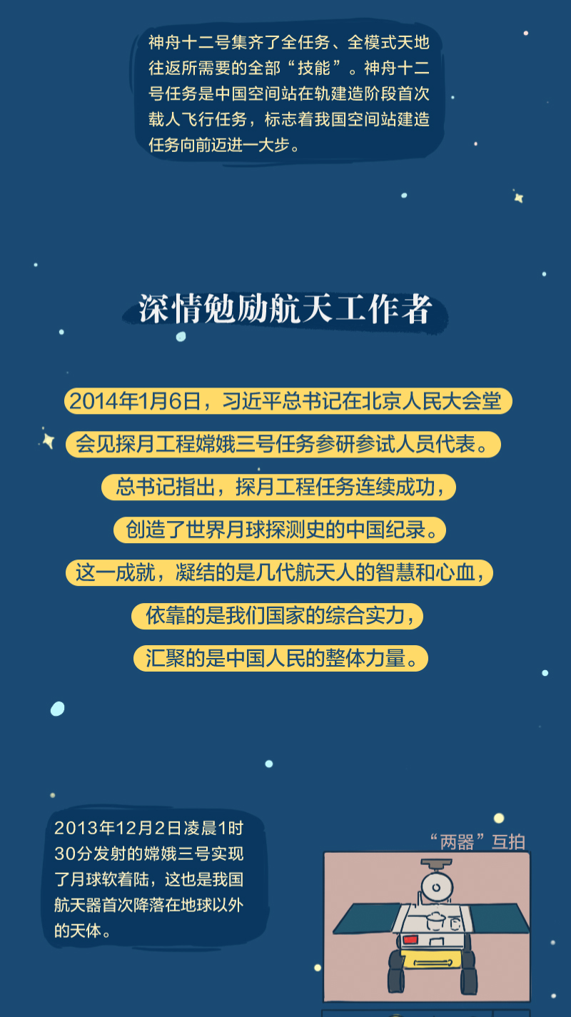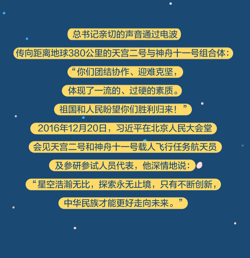 黨的十八大以來,總書記始終高度關(guān)注我國航天事業(yè)發(fā)展,多次同執(zhí)行任務(wù)的航天員展開“天地通話”、給參與“東方紅一號”任務(wù)的老科學(xué)家回信、親切接見航天工作者、深情寄語航天人……