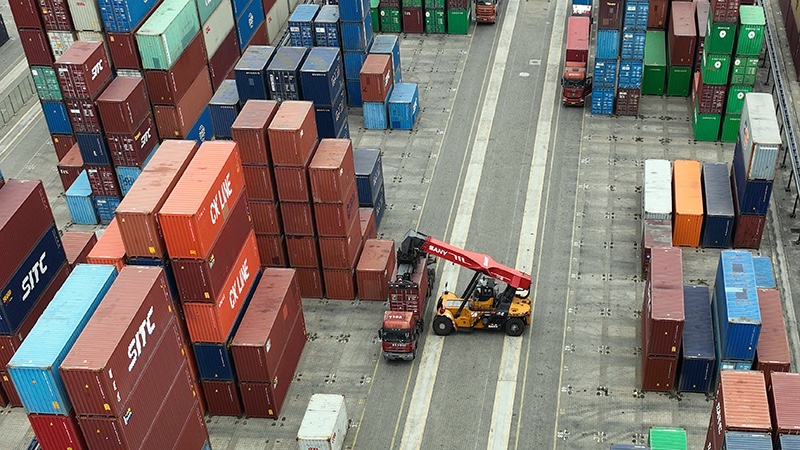 2023年2月15日,工人在廣西欽州港集裝箱碼頭駕駛裝卸車(chē)調(diào)運(yùn)集裝箱(無(wú)人機(jī)照片)。