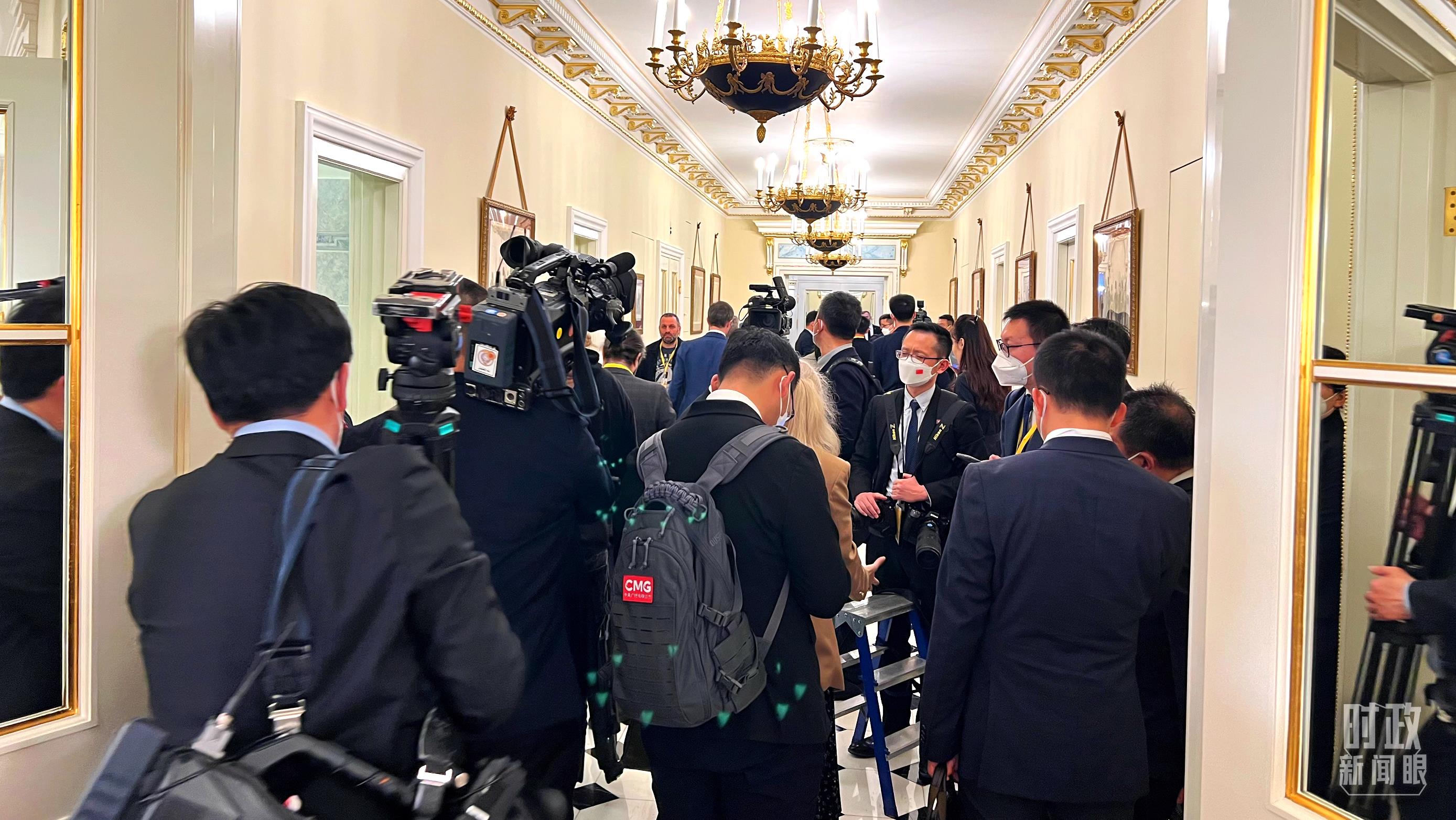 △等待進(jìn)入會場的新聞記者擠滿走廊。(總臺央視記者程鋮拍攝)