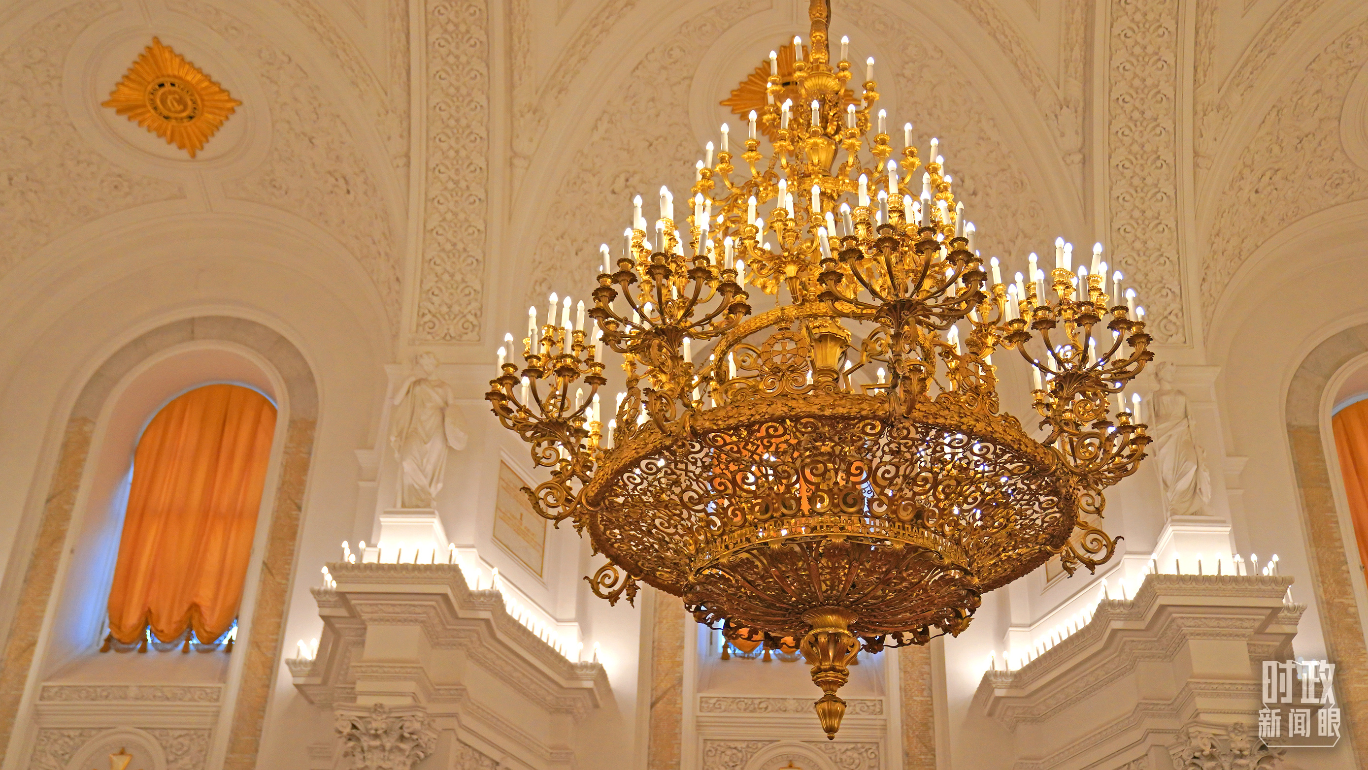 金色的燈盞、白色的浮雕、紅色的地毯,當(dāng)天的喬治大廳璀璨、莊重。在雄壯激昂的迎賓曲中,習(xí)主席和普京總統(tǒng)分別從喬治大廳兩側(cè)沿紅地毯闊步走入大廳中央,兩國元首緊緊握手,合影留念。