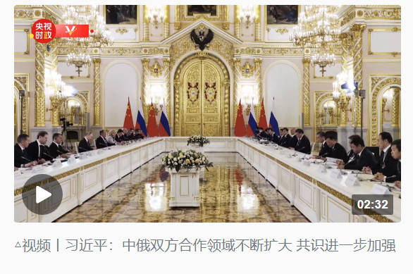 習(xí)主席當(dāng)天在克里姆林宮的活動從下午持續(xù)到晚上。兩國元首先后舉行小范圍、大范圍會談。會談后,兩國元首共同簽署了兩份重磅聯(lián)合聲明,并共同會見記者。當(dāng)晚,普京總統(tǒng)還為習(xí)主席舉行了隆重的歡迎宴會。