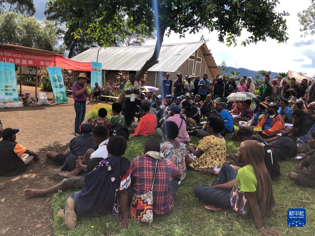 中國(guó)援巴布亞新幾內(nèi)亞菌草旱稻項(xiàng)目專家組組長(zhǎng)林應(yīng)興(戴草帽者)在巴布亞新幾內(nèi)亞東高地省中國(guó)援助巴新菌草和旱稻技術(shù)項(xiàng)目第9期培訓(xùn)班上授課(2020年12月15日攝)。新華社發(fā)
