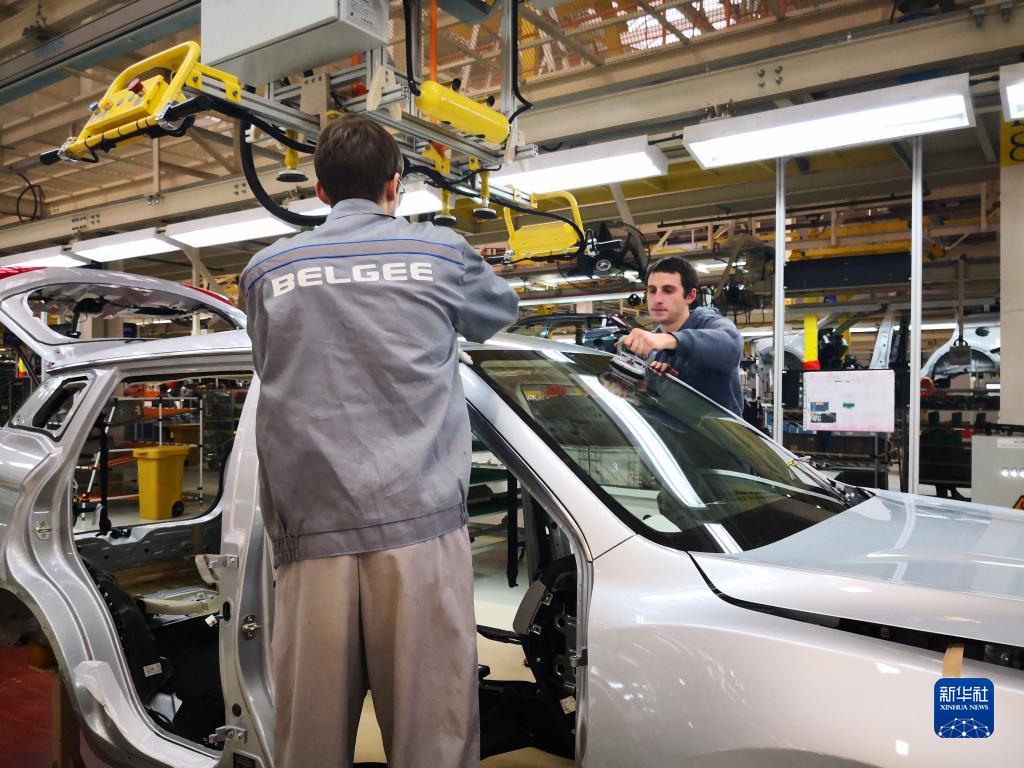 在白俄羅斯首都明斯克東北方向50公里處的白俄羅斯吉利全散件汽車制造廠總裝車間,工人在組裝車體(手機(jī)照片,2018年12月1日攝)。新華社記者 張若玄 攝