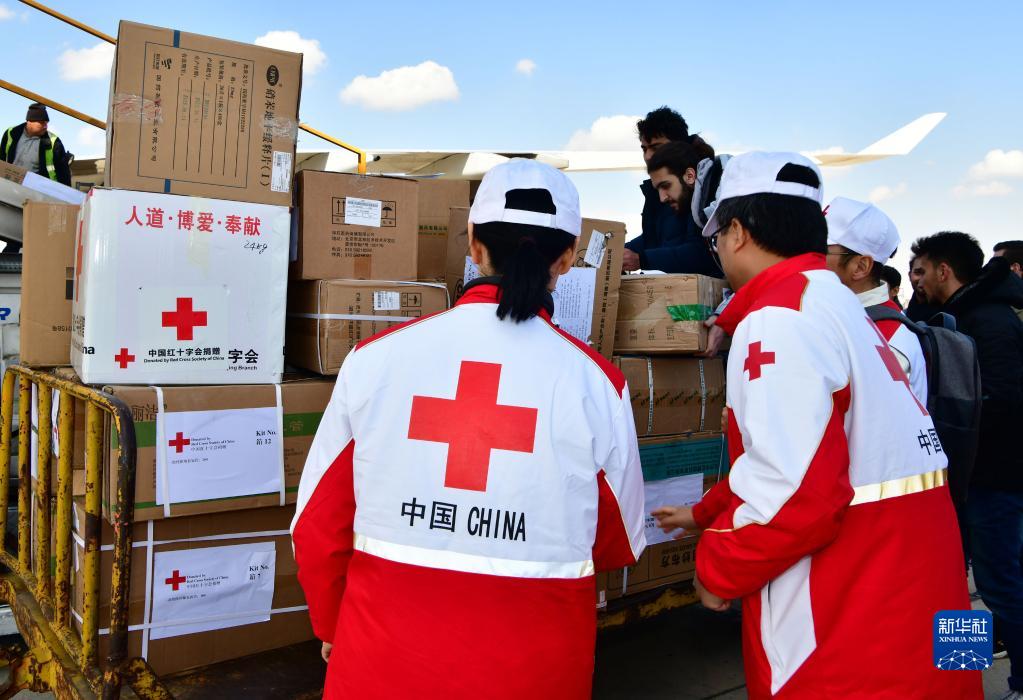 工作人員在敘利亞大馬士革國(guó)際機(jī)場(chǎng)卸載中國(guó)紅十字會(huì)援助的人道主義物資(2023年2月13日攝)。新華社發(fā)(阿馬爾·薩法爾賈拉尼攝)