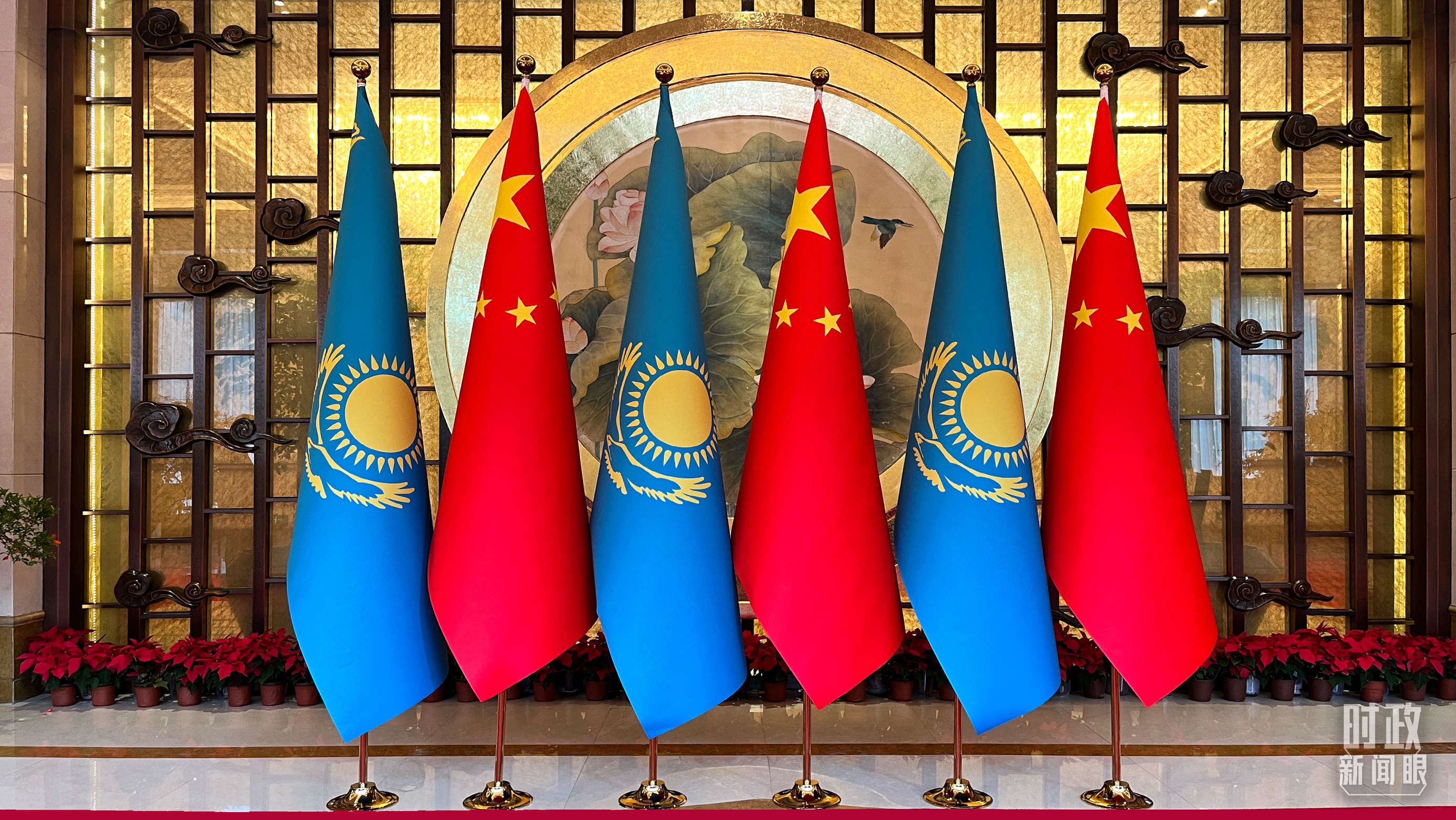 △中哈兩國(guó)元首會(huì)談現(xiàn)場(chǎng)外布置的兩國(guó)國(guó)旗。(總臺(tái)央視記者陸泓宇拍攝)