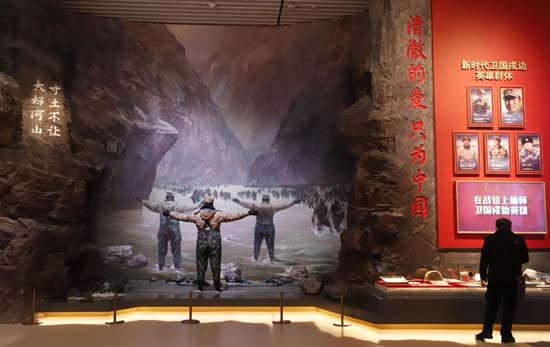 △“領(lǐng)航強軍向復(fù)興——新時代國防和軍隊建設(shè)成就展”上展出的衛(wèi)國戍邊英雄事跡。