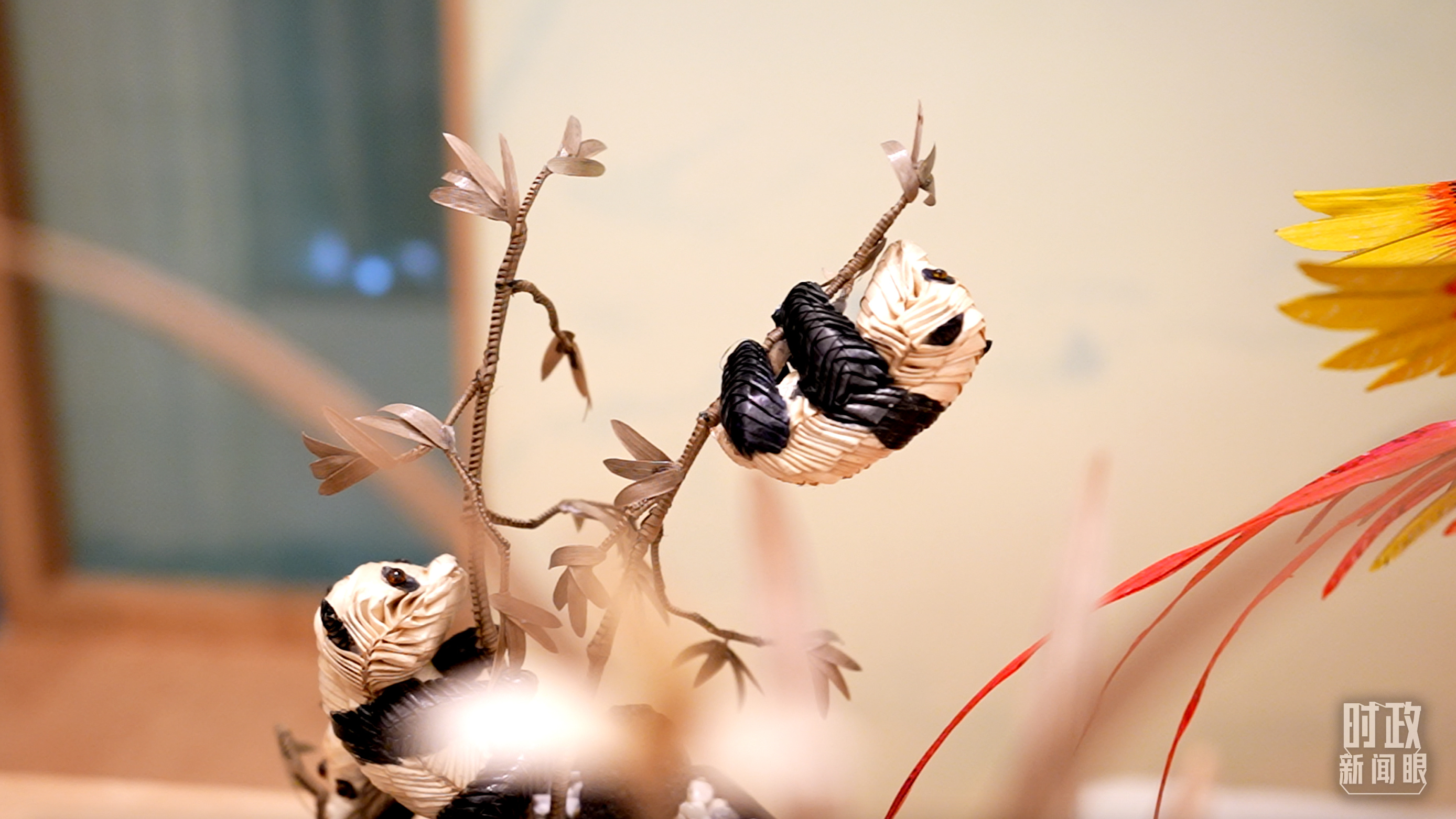 △為國際貴賓展示的四川非物質(zhì)文化遺產(chǎn)棕編和蜀繡。(總臺央視記者蔣碩、韓銳拍攝)