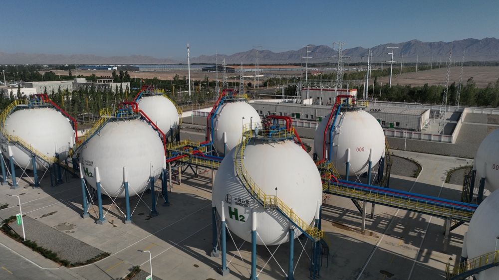 這是2023年6月30日拍攝的中國石化新疆庫車綠氫示范項(xiàng)目制氫廠儲(chǔ)氫罐區(qū)(無人機(jī)照片)。新華社記者 顧煜 攝